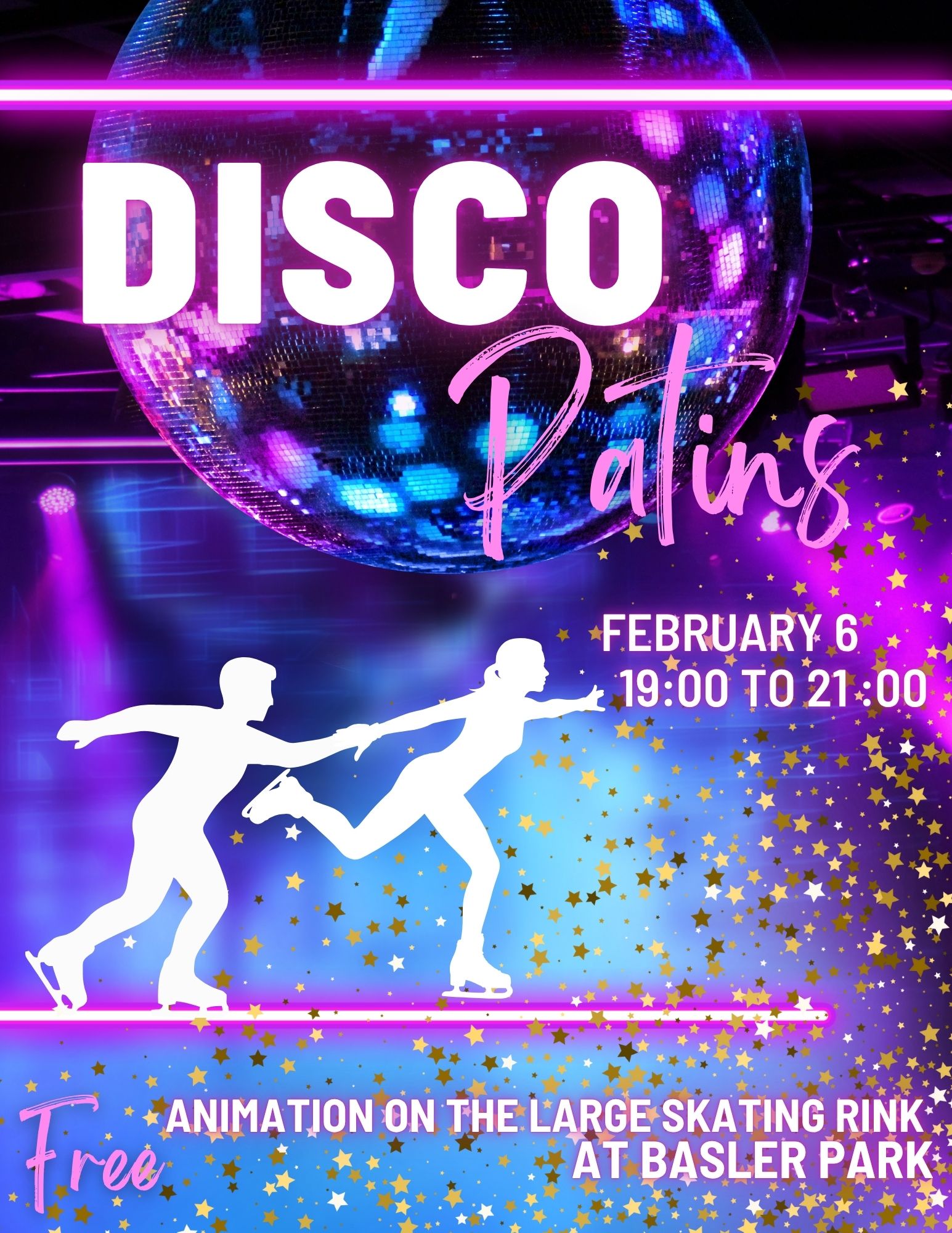 Venez nous rejoindre au parc Basler pour l’événement Disco-Patins ; c’est gratuit ! Musique et lumières de projection vous permettront de patiner dans une ambiance chaleureuse et amusante. On vous attend en grand nombre ! Feu de camp, chocolat chaud et collations seront offerts aux participants.